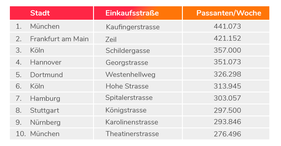 Erstellung der Top 10 deutschen Einkaufsstraßen in Bezug auf Footfall