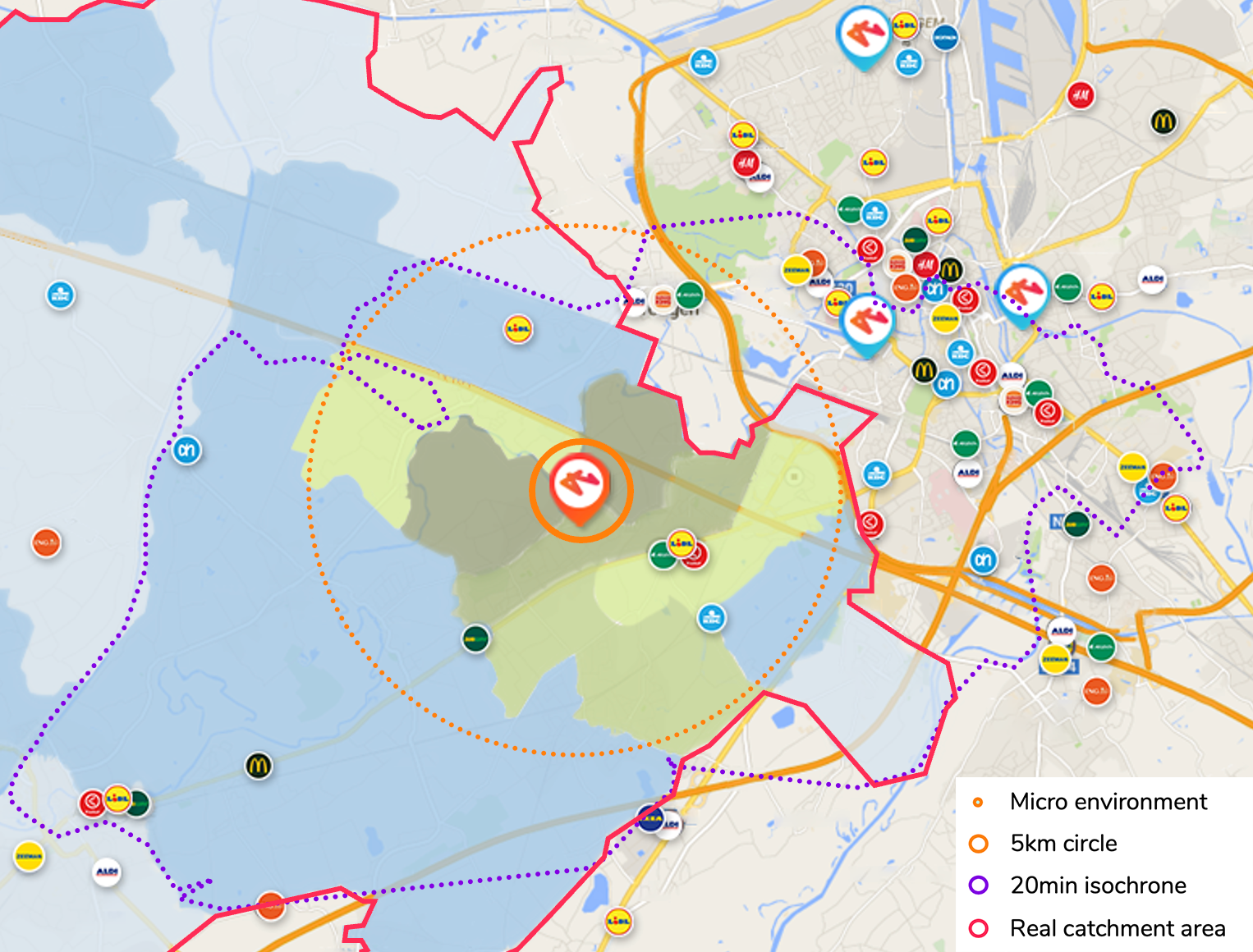 So, you should look at the available market space (the “area's DNA”): the total market potential in the area around each of your stores in relation to the competitive pressure and the presence of any other stores of your chain (internal cannibalisation).
