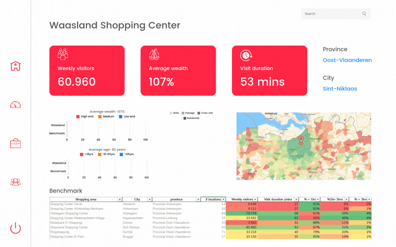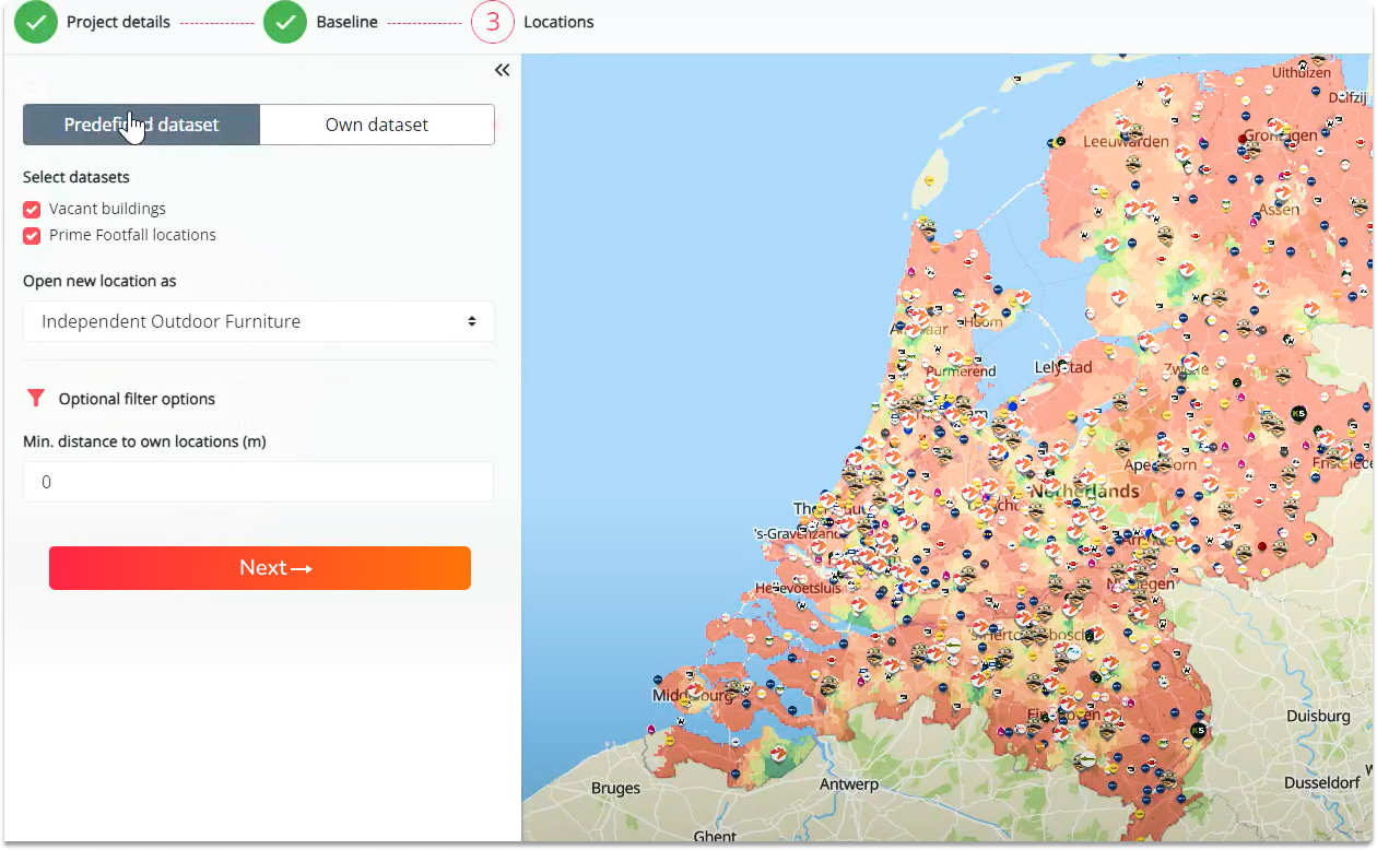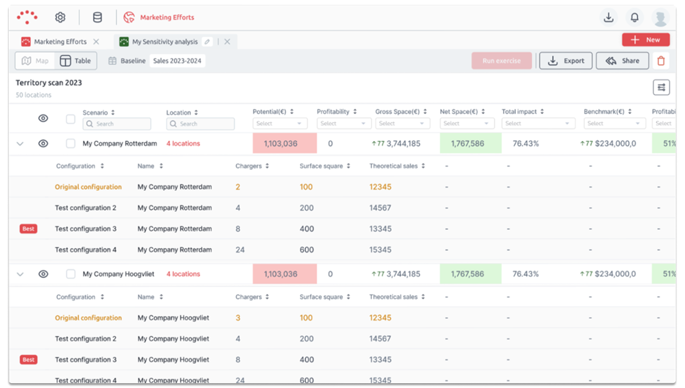 Want to open 50 new locations? Or find the best closures with minimal churn? All possible locations and openings can be tested in batch to find the most profitable expansion scenario for you. To start this process you can easily construct inspiration sets of potential locations by selecting predefined sets of sector-specified shopping hotspots. Or add all currently vacant retail real estate locations with the push of a button. Even locations from other individual retailers can be added with 1 click. This is handy if you know your preferred “perfect neighbours” or if a large retail chain recently closed their doors and you want to explore which of their locations could be interesting for your network. Work faster and stay one step ahead by letting us inspire your analysis!
