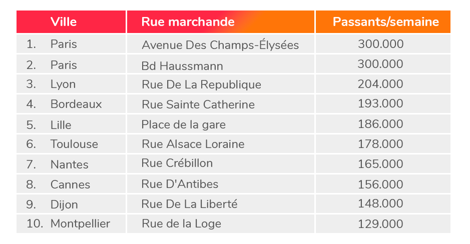 Combien de passants ont arpenté les principales rues commerçantes de France l'année dernière ? Nos experts se sont penchés sur les données issue des smartphones et ont établi le top 10 des rues les plus fréquentées. Dans quelle rue se trouvent vos boutiques ?