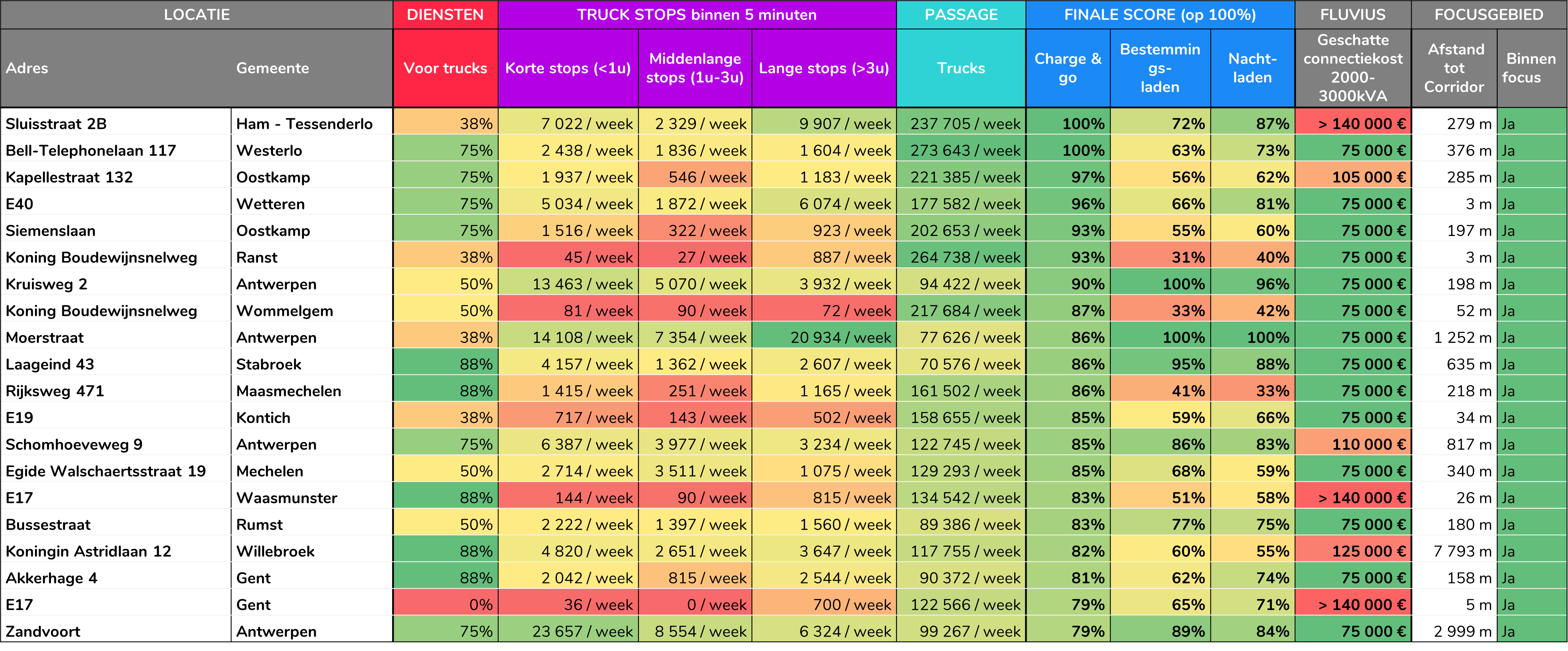 RetailSonar a également analysé les lieux où les camions circulent et effectuent leurs pauses aujourd’hui, ainsi que l’évolution attendue d’ici 2030. Sur cette base, les besoins en infrastructure de recharge pour les camions électriques ont été cartographiés par commune. Cette analyse permet aux pouvoirs publics et aux investisseurs d’identifier les zones où les besoins en recharge seront les plus importants dans un avenir proche.
