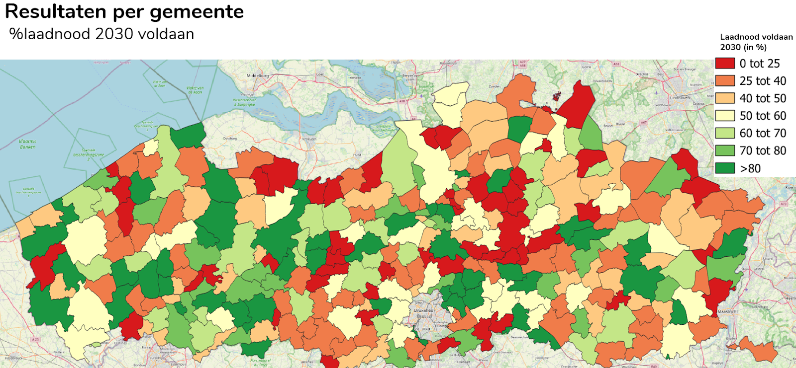 RetailSonar berekende per gemeente de minimale laadbehoefte voor 2030 en vergeleek die met de huidige infrastructuur. Zo werd voor elke gemeente het percentage van de laadnood (2030) dat al voldaan is in kaart gebracht.