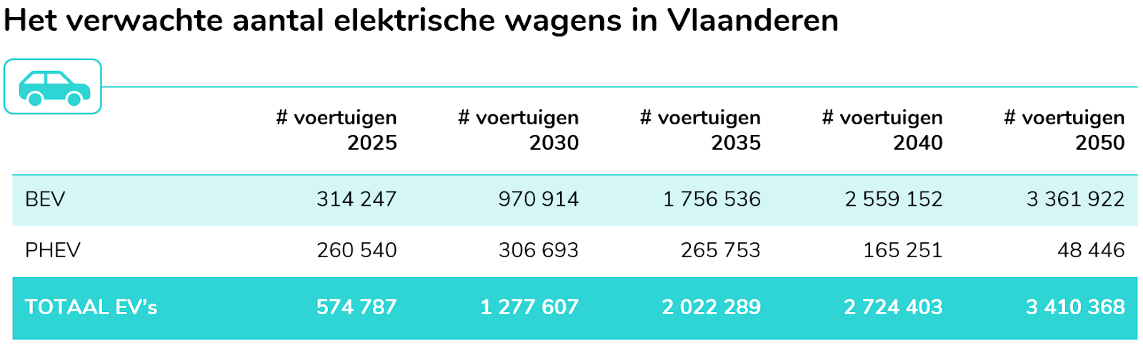 Maar uiteraard volstaat dit nog niet om klaar te zijn voor de snel groeiende elektrische vloot van de komende jaren. Op basis van het verwachte toekomstige aantal elektrische wagens zal extra capaciteit noodzakelijk zijn om aan de toekomstige vraag te voldoen: