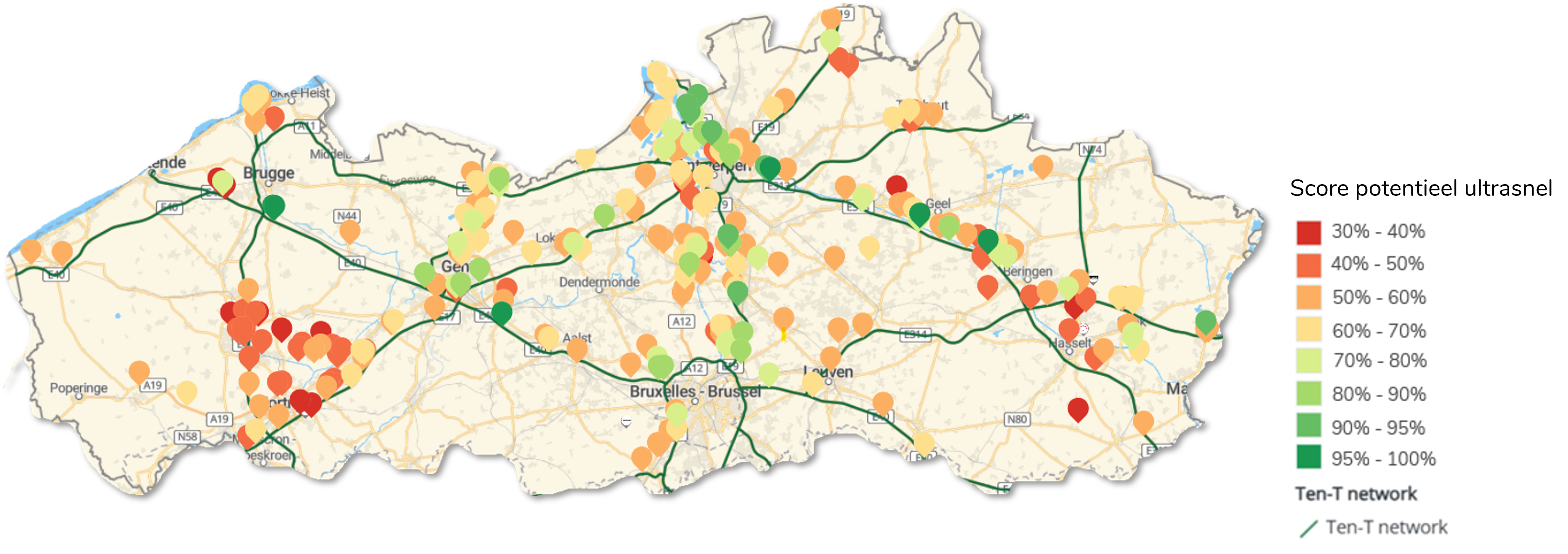 RetailSonar analyseerde ook waar vrachtwagens vandaag rijden en pauzeren, in combinatie met de verwachte evolutie tegen 2030. Op basis daarvan is de benodigde laadinfrastructuur per gemeente voor elektrisch vrachtverkeer in kaart gebracht. Dit geeft overheden en investeerders een beeld van waar de grootste noden komen te liggen voor truck laden in de nabije toekomst.