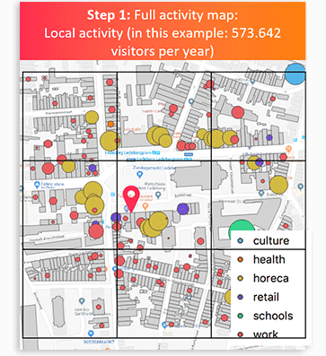 Maar hoe breng je deze dynamiek nu data-gedreven in kaart? Matthias De Beule, project leader bij RetailSonar, verduidelijkt. "Eerst brachten we alle voornaamste economische activiteit in beeld. Dat deden we niet enkel voor retail, maar ook voor openbaar vervoer, horeca, dienstverlening, sport, ontspanning, scholen of tewerkstelling. Voor elke activiteit maakten we vervolgens een gevalideerde inschatting van het totale aantal bezoeken per jaar. Zo kwamen we tot een gedetailleerde en overzichtelijke activiteitenkaart."