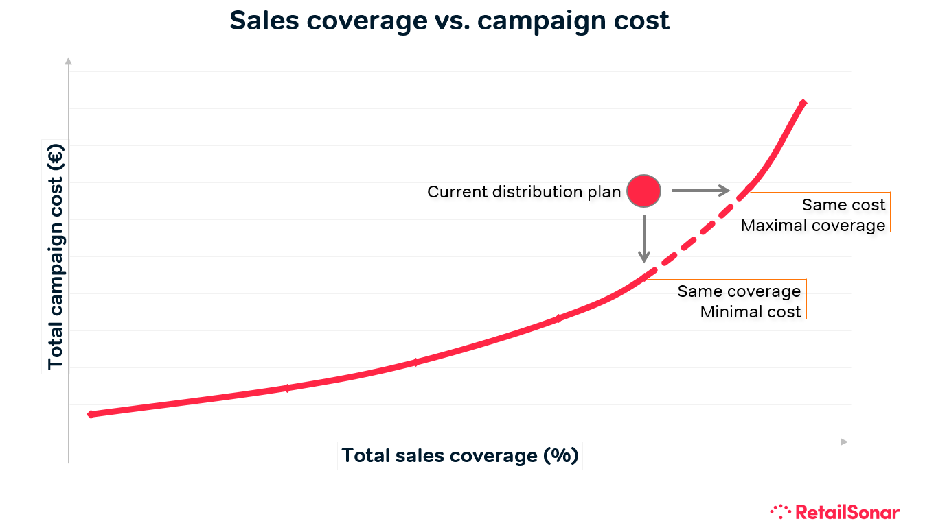 In een optimaal bedeelmodel worden klantenpotentieel en kosten dus steeds tegenover elkaar afgewogen. Je kan dus in twee richtingen optimaliseren. Enerzijds kan je ervoor kiezen om evenveel mensen te bereiken aan een lagere kost. Anderzijds kan je ook proberen om een maximale sales coverage na te streven voor het bedrag dat je momenteel al betaalt (zie grafiek).