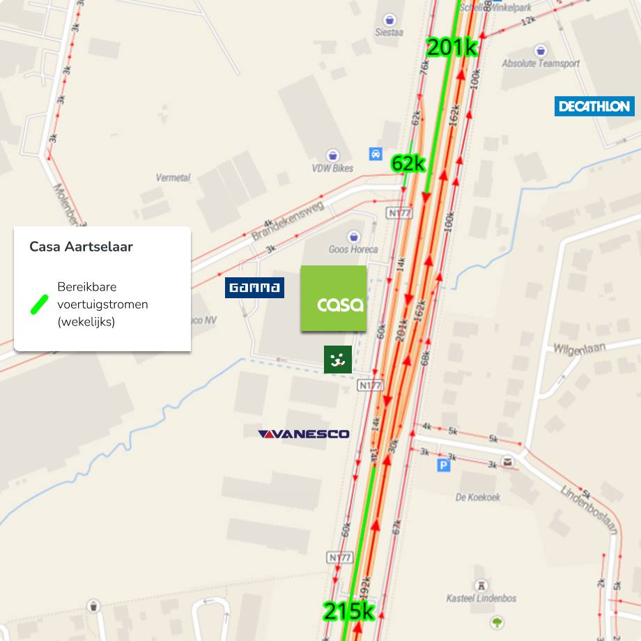 Deze locatie aan de A12 in Aartselaar, vlakbij de grens met Schelle, heeft de hoogste voertuigpassage van alle CASA-vestigingen, en scoort hier heel sterk met 478.000 wagens per week. Met een winkeloppervlakte van 1170 m² en goede parkeergelegenheid is dit premium winkelvastgoed aan één van de bekendste (en meest omstreden) baanconcentraties van het land. Omliggend zien we ook sterke trekkers zoals Gamma en Maxi Zoo. Iets verder langs de A12 vinden we ook andere winkels zoals Action, Hema en Decathlon.