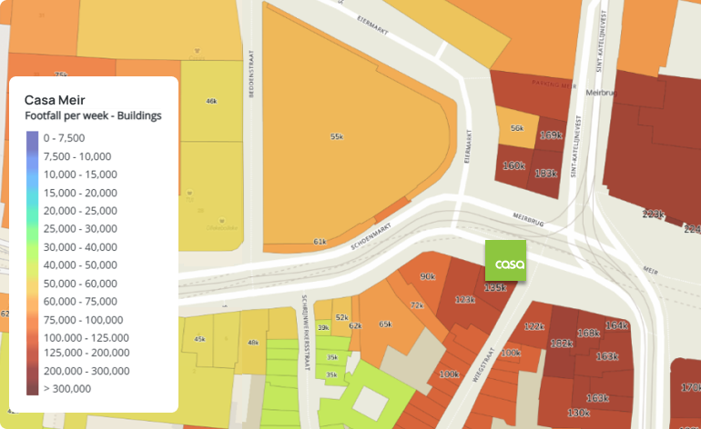 Deze CASA winkel heeft de hoogste voetgangersstroom van alle CASA-winkels, met zijn ligging aan de Meir, de drukste winkelstraat van Vlaanderen. Langs de winkel gaan wekelijks maar liefst 135.000 shoppers voorbij, en met een winkeloppervlakte van 432 m² is het een interessante locatie voor vele merken. In de buurt liggen voornamelijk de kledingwinkels en fast serving restaurants die de shopping buurt rijk is. Ook zijn er directe concurrenten op wandelafstand van de winkel, zoals Hema, Action en Zara Home.